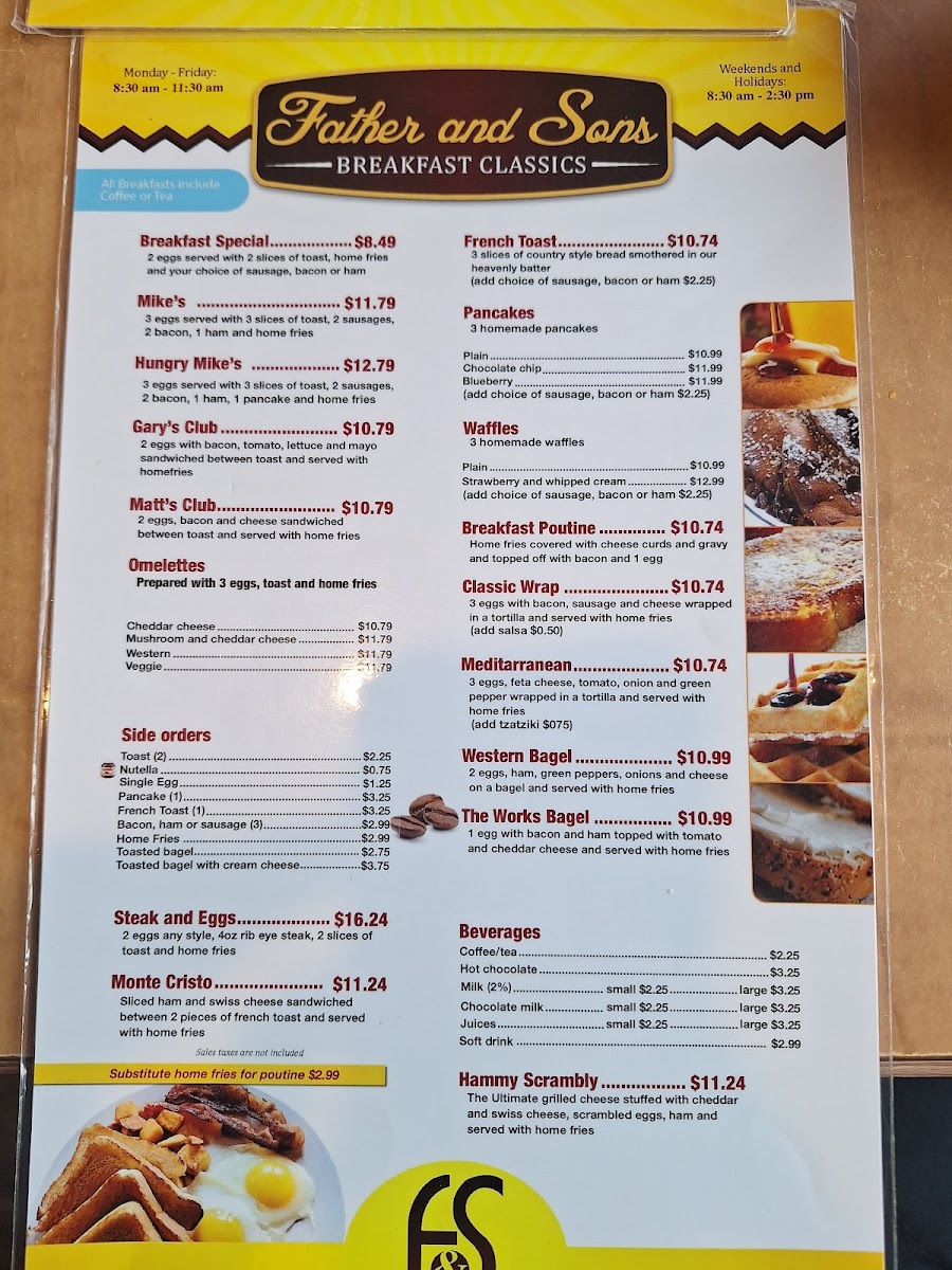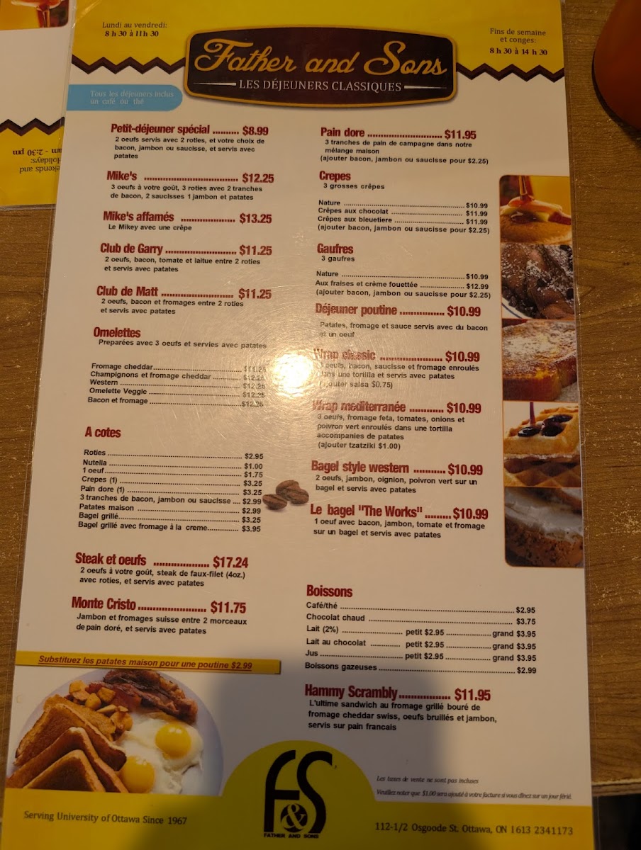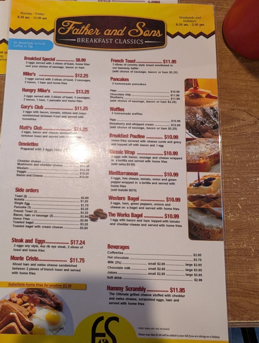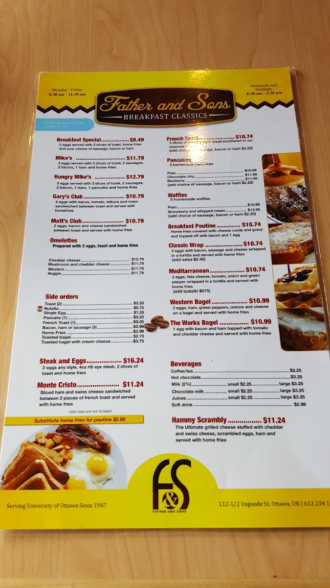Welcome to Father & Sons Restaurant, a delightful culinary gem nestled in Ottawa. With its cozy atmosphere and friendly service, this eatery captures the essence of comfort food, specializing in breakfast classics that keep patrons returning for more.